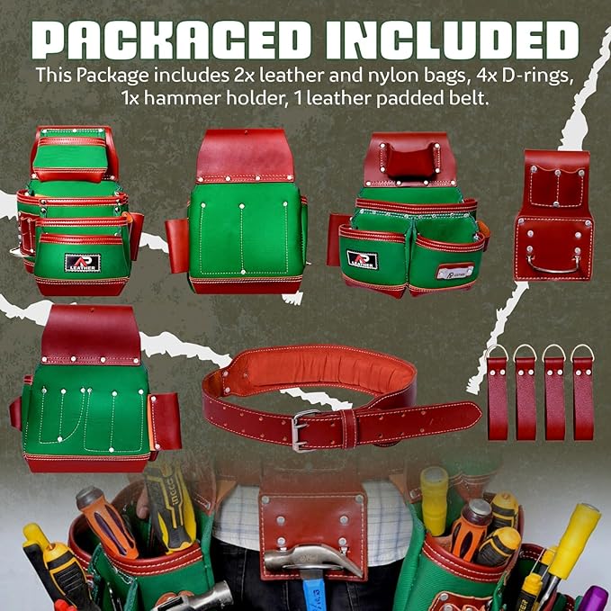 - 🔹 Premium Leather & Canvas Tool Belt – Crafted from heavy-duty leather and rugged canvas for maximum durability. Reinforced with heavy-duty rivets and strong stitching, this green tool belt pouch is perfect for professional carpenters, framers, electricians, farmers, and construction workers.