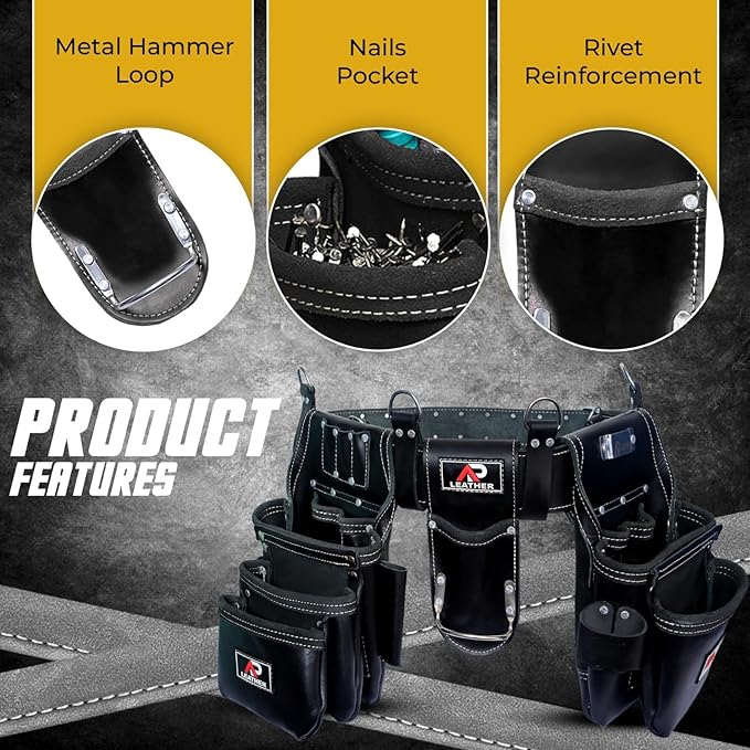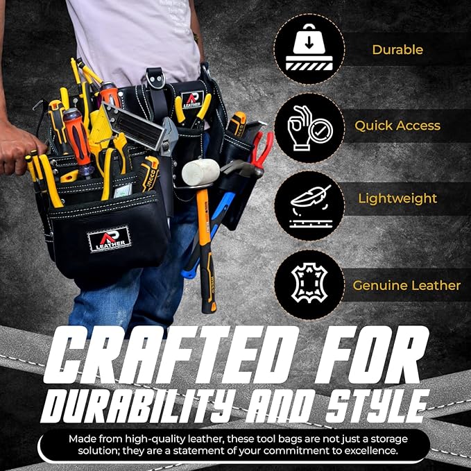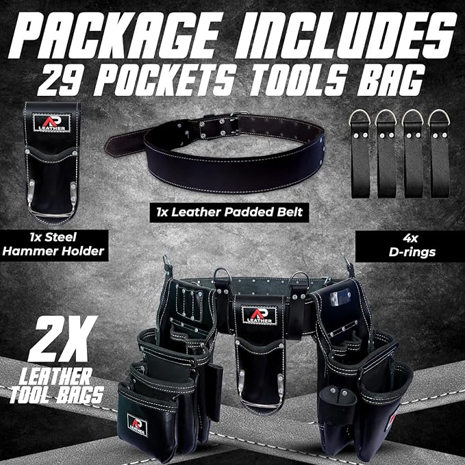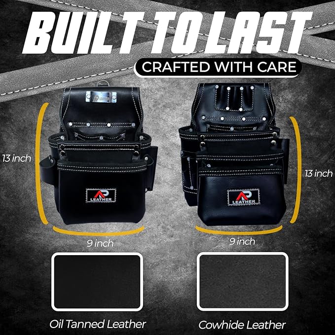 - 👍 This carpenter tool pouch is made with heavy duty grain leather , stainless steel buckle and foam padding . Ap leather made this pouch with double stitching for long durability .