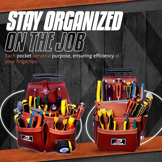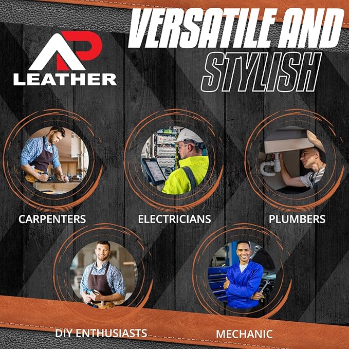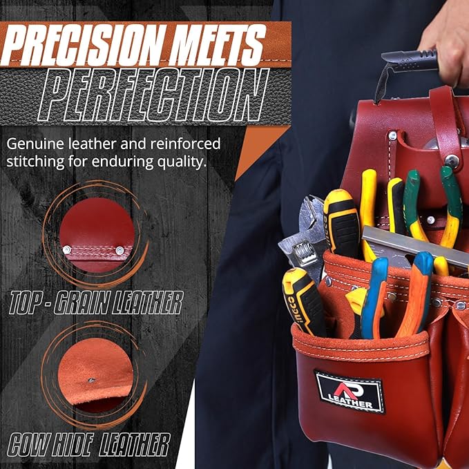 - 👍 This carpenter tool pouch is made with heavy duty grain leather , stainless steel buckle and foam padding . Ap leather made this pouch with double stitching for long durability .