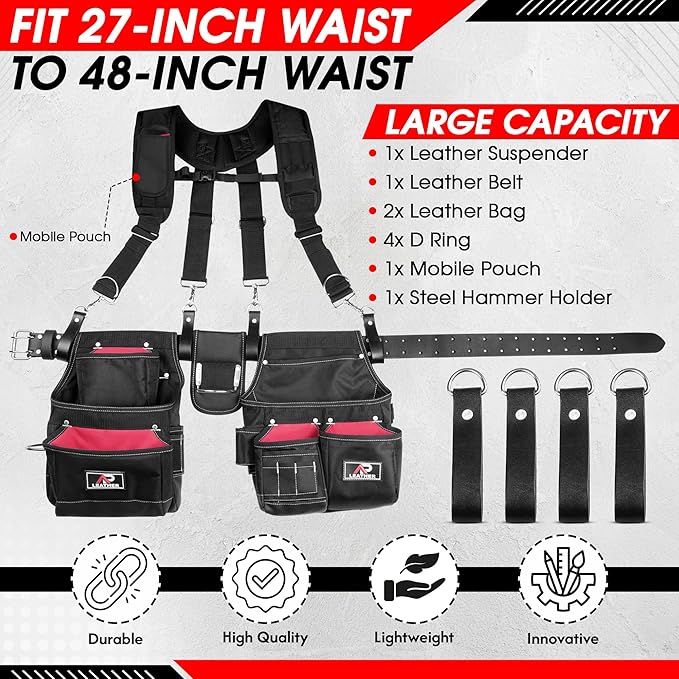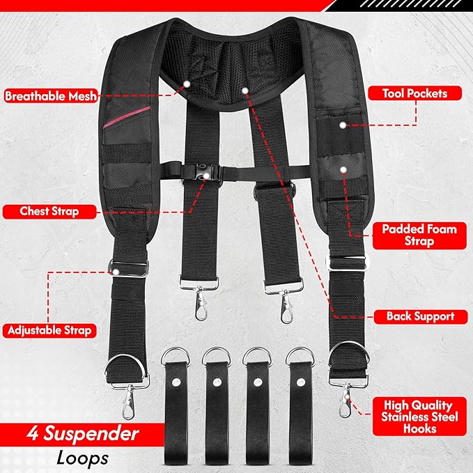 - Enhanced Convenience: Designed to fit waist sizes from 30 to 50 inches, this tool belt with padding foam provides comfort, while the 4 suspender loops allow for additional support and stability, reducing strain during extended wear.